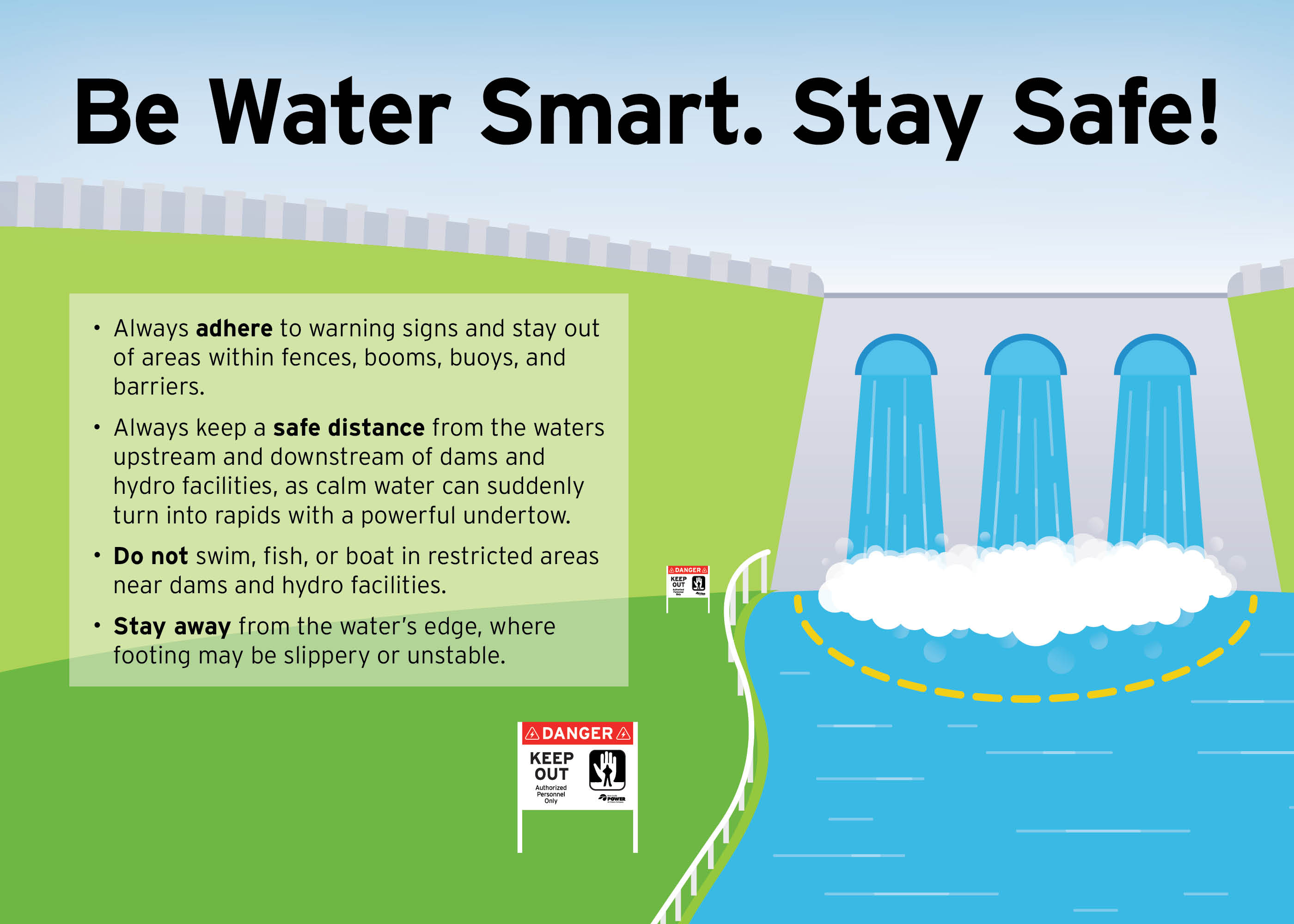 Stay away from our electrical equipment and infrastructure, including transmission towers, hydro dams, power lines, and substations. Respect all warning signs. Do not climb transmission towers or trespass on our property. Safety always comes first.